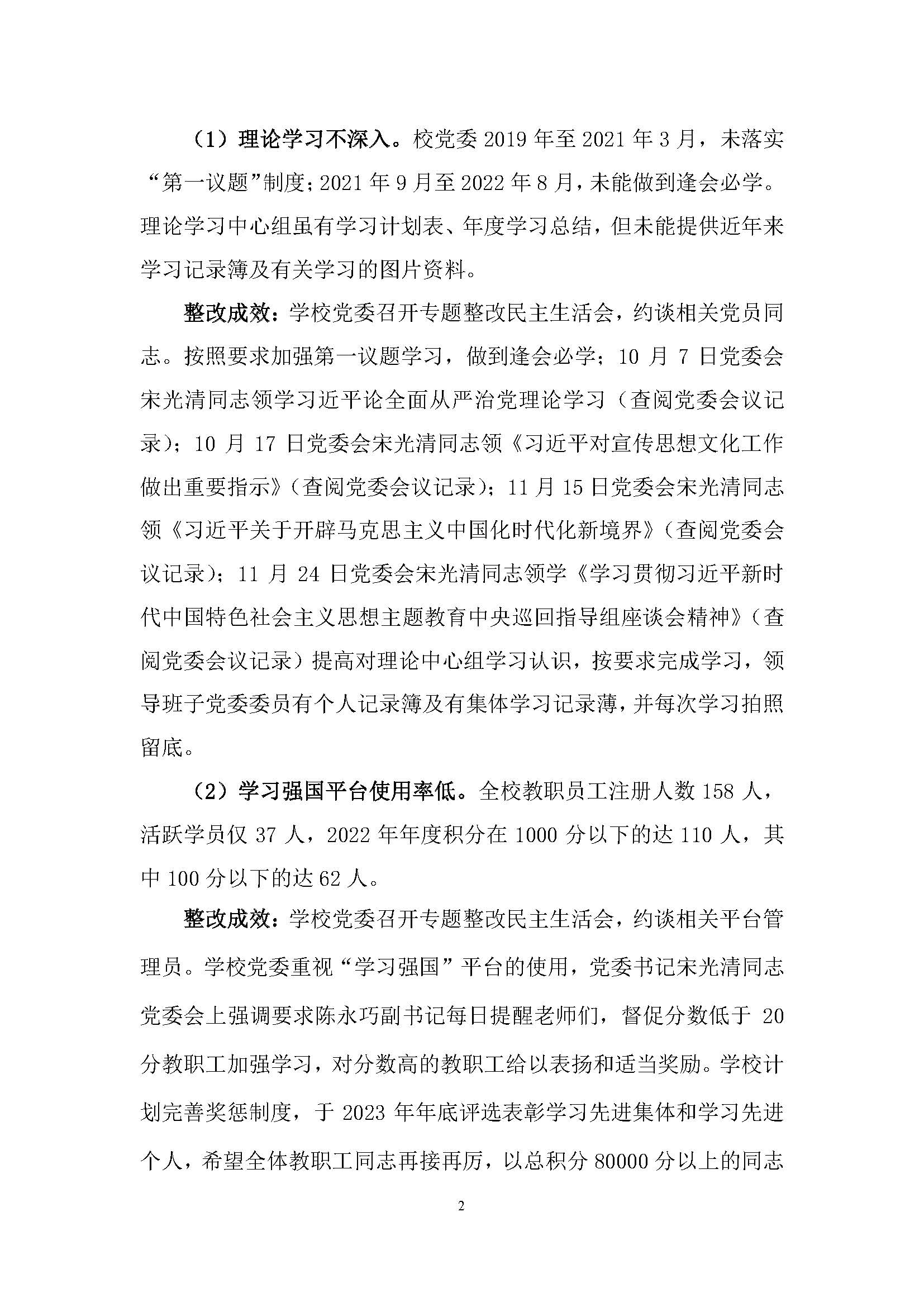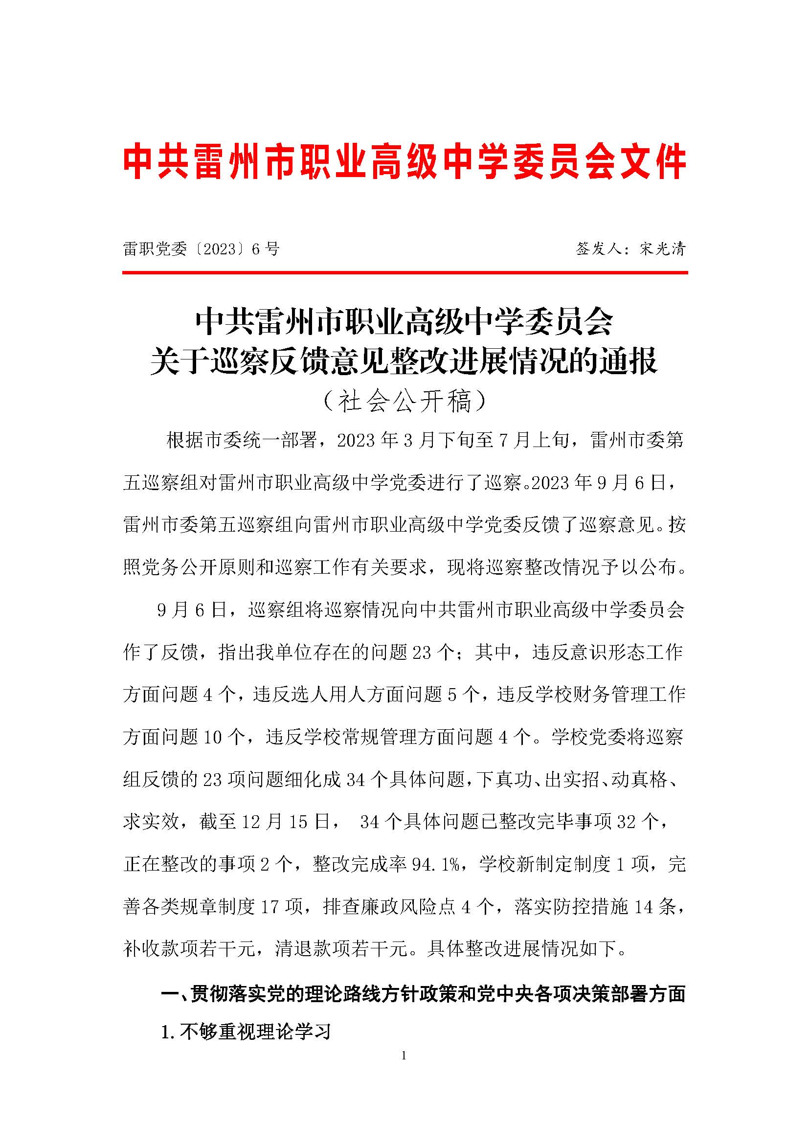 中共雷州市职业高级中学委员会关于巡察反馈意见整改进展情况的通报